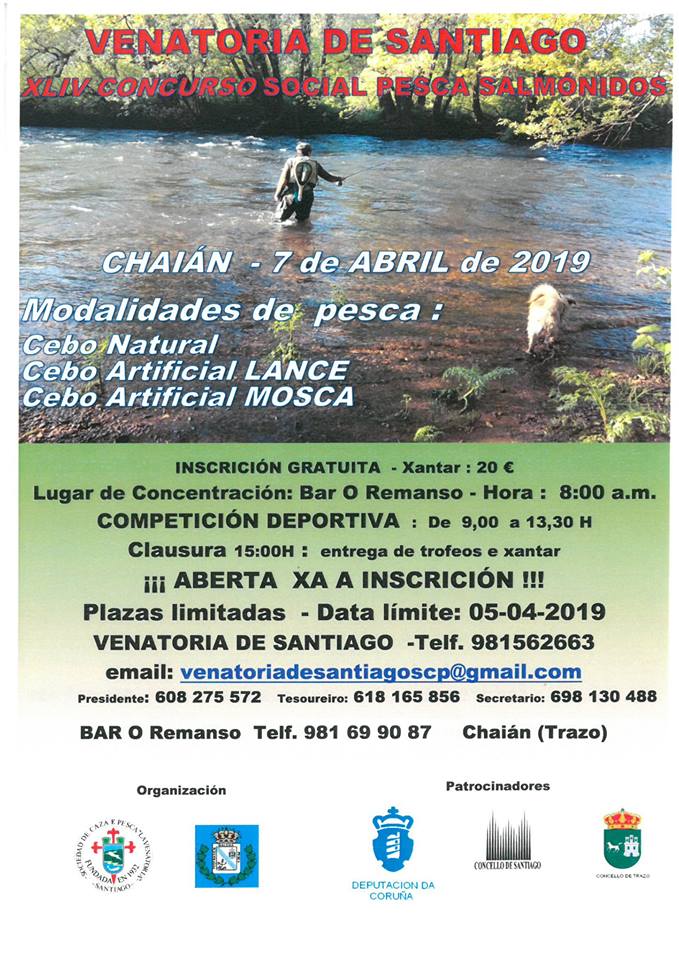 O 17 de maio, DÍA DAS LETRAS GALEGAS a Venatoria voltou a organizar o seu esperado XLV CONCURSO SOCIAL DE PESCA SALMÓNIDOS, no couto de Chaián, río Tambre. Esta competición que xa non se poido celebrar durante os anos 2020 e 2021 por mor da pandemia, estaba programada para o pasado dia 17 de abril e tamén se suspendeu.