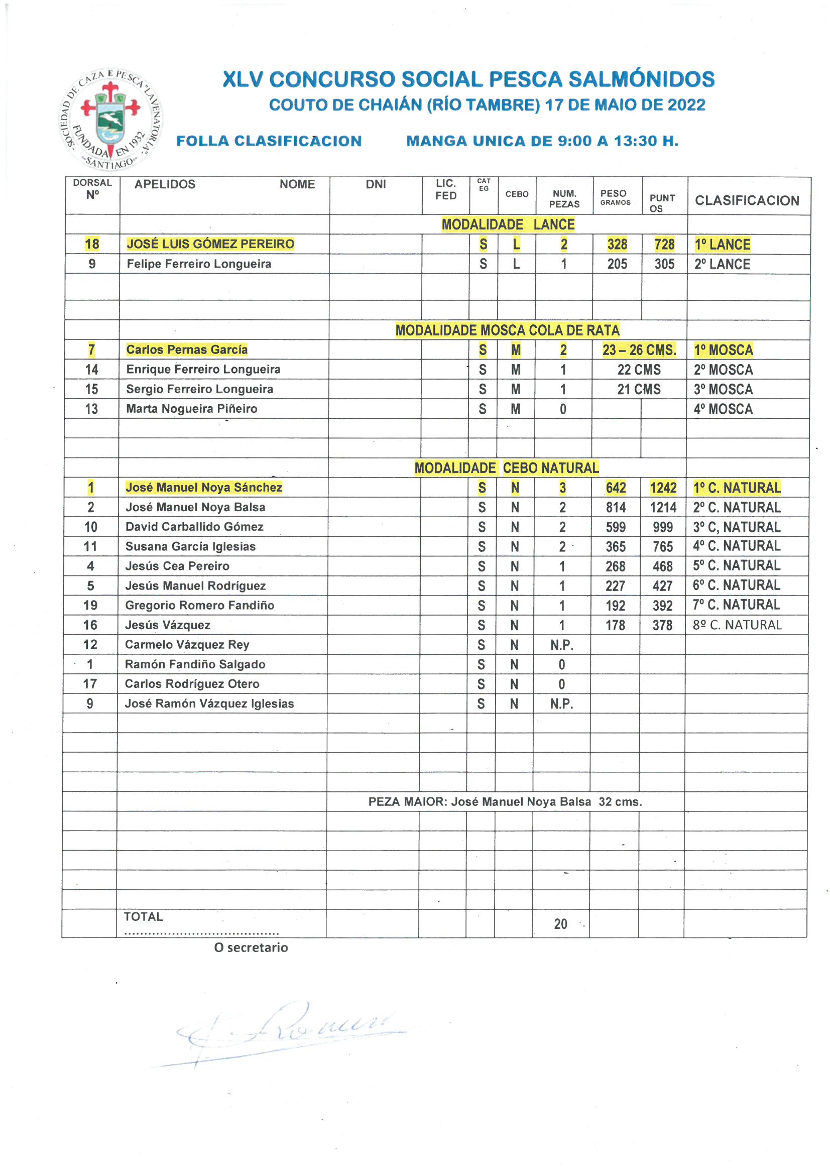 Peza maior: J.M.Noya Balsa Cebo natural: Posto 7º - Gregorio Cebo natural: 8º Posto: Jesús Vázquez