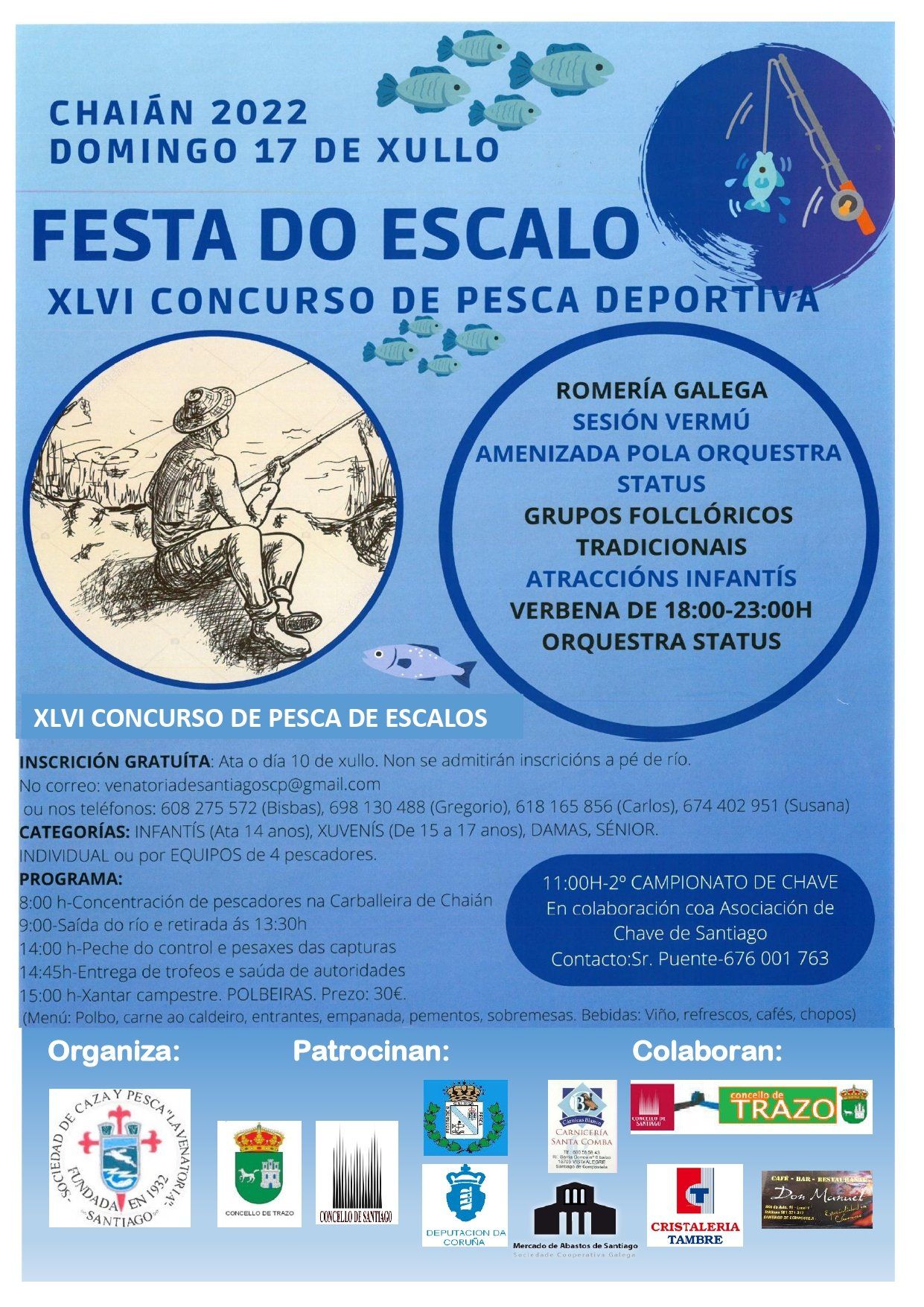 Se o derradeiro día 17 de maio no Concurso Social de Salmónidos, os pescadores soportaron unhas inclemencias meteorolóxicas moi duras e adversas para a pesca, frío, chuvia, (caía auga como si a tirasen a caldeiros), lóstregos e treboadas que non deron tregua en toda a mañán, pola contra neste 17 de xullo na XLVI Festa do Escalo 2022 tivemos que superar a abraiante e asfixiante ola de calor que tampouco foi quen de arredar do río Tambre as 25 persoas que disputaron esta proba de pesca deportiva, nin as máis de 400 persoas asistentes que se achegaron a carballeira de Chaián